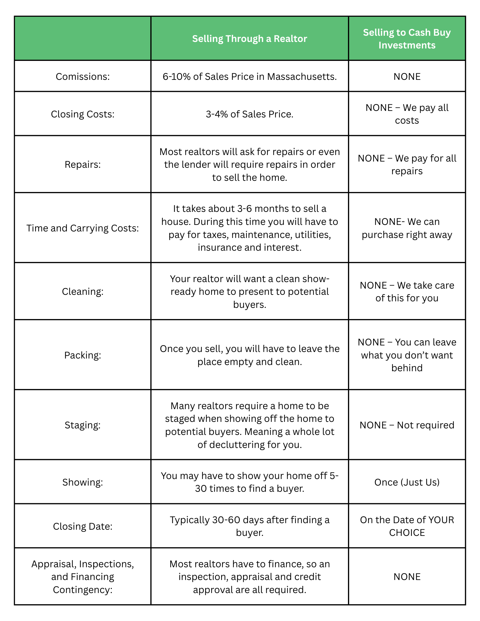 See below for a detailed comparison of selling to a Investor vs a Realtor: